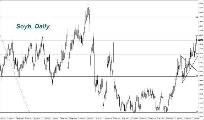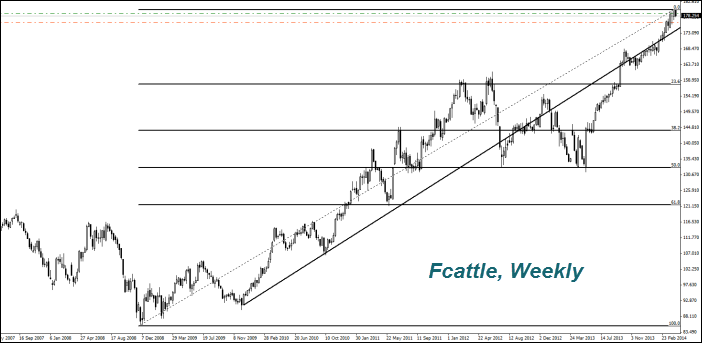 We do not rule out a downward correction of futures prices for frozen beef (Fcattle). The U.S. Department of Agriculture (USDA) said that the beef price will go up by 4% in 2014 and it already has grown since the beginning of the year by almost 8%. Some market participants do not exclude any USDA steps to settle the situation. Now the total number of cattle in the U.S. is at the minimum since 1951 and the country imports meat. We do not exclude that it may happen because of subsidies to farmers for growing the biofuel crops.