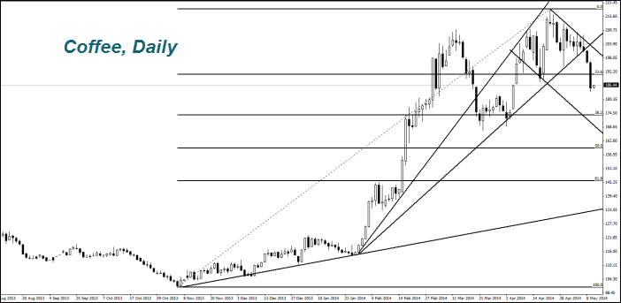 As we predicted in our previous reviews, the Coffee prices have the downward correction started. Vietnamese manufacturers have begun implementing the last crop stocks. Now the stocks have decreased to 390 thousand tons, which is one fourth below the average level for 5 years. Thus the importance of this factor has decreased significantly. At the same time the forecast revision for the crop in Brazil has a positive impact on the Coffee prices. Investors believe that the impact of the drought was understated. According to the Fundacao Procafe non-profit agency, the coffee harvest in Brazil may be only 40,1-43,3 million bags (60 kg each). This is much less than the government forecast of 49 million bags and it could be supported in the future quotes.