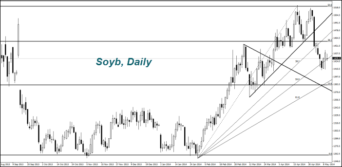 The Corn prices decreased due to the revaluation of its stocks in the United States. The USDA reduced its forecast for stocks in the season 2013/2014 to 1,146 million bushels (more significantly than expected). However, expectations for stocks in the season 2014/2015 have been increased even more dramatically, up to 1,726 million bushels. Additional negative factor for the stocks was the USDA forecast for average farm prices in the season 2014/2015 at $4,2 per bushel. This is lower than their estimates for the season 2013/2014, which is $4,65 per bushel and below the current futures prices (about $5,1).