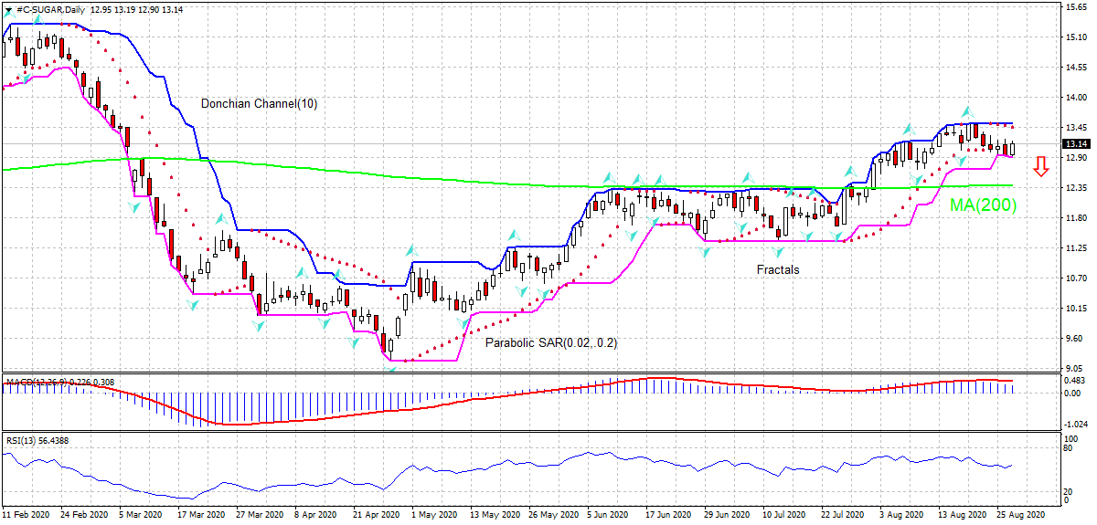 On the daily timeframe #C-SUGAR: D1 is retracing down toward the 200-day moving average MA(200) which is rising yet. We believe the bearish momentum will continue after the price breaches below the lower boundary of Donchian channel at 12.9. This level can be used as an entry point for placing a pending order to sell. The stop loss can be placed above the last fractal high at 13.5. After placing the order, the stop loss is to be moved every day to the next fractal high, following Parabolic signals. Thus, we are changing the expected profit/loss ratio to the breakeven point. If the price meets the stop loss level (13.5) without reaching the order (12.9), we recommend cancelling the order: the market has undergone internal changes which were not taken into account.