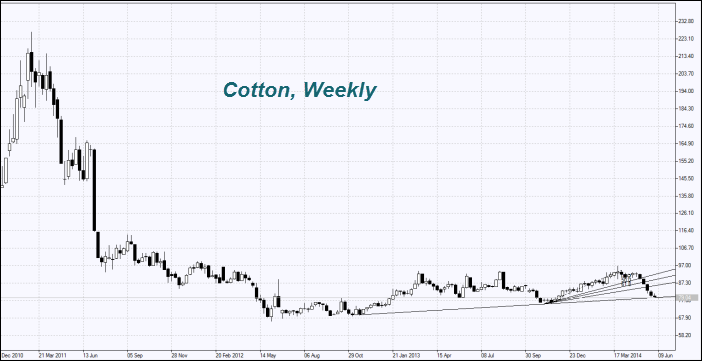 قیمت پنبه همچنان کاهش پیدا کرد که به دلیل انتشار گزارشی بود حاکی از آنکه زمین زیر کشت در هندوستان با 3.4% افزایش به 12 میلیون هکتار رسیده است که از 2011 تاکنون بی سابقه می باشد. توجه داشته باشید که پنبه در هندوستان 0.8773 دلار به ازای هر پوند قیمت دارد. که اندکی از قیمت 0.8488 دلار در ایالات متحده گران تر است. قیمت پنبه از اوایل ماه مه تاکنون 15% کاهش داشته است که به دلیل کاهش 64درصدی واردات چین در سه ماهۀ اول سال جاری میلادی است. از آنجائیکه چین تصمیم گرفته است تا بخشی از موجودی پنبۀ انبارها را به فروش برساند. از اصلاح قیمت ها در هنگامیکه این اجرا شود صرف نظر نمی کنیم. کمیتۀ بین المللی شورای پنبه پیش بینی کرده است که محصول پنبه در چین در فصل 2014-2015 با 10% کاهش به 6 میلیون تن کاهش پیدا کند که به دلیل احتمال خشکسالی است. همزمان، اتحادیۀ پنیۀ هندوستان، انتظار دارد که وارد پنبه از هند در مقایسه با 2013-2012 کاهش داشته باشد.