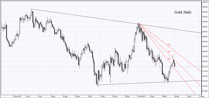 قیمت طلا علی رغم وجود چشم انداز افزایش نرخ بهره، برای دو روز متوالی به عقب برگشت. فدرال ریزرو ایالات متحده این تصمیم را با بیان این نکته که آمارهای اقتصاد کلان بهتر شده اند توجیح کرد. این احتمال وجود دارد که روند بهبود اقتصاد همراه با افزایش ارزش دلار منجر به کاهش قیمت طلا گردند. تثبیت وضعیت سیاسی در یمن فشار بیشتری روی طلا وارد کرد. لازم به ذکر است که روحیۀ درهم آمیخته در بازار طلا باعث افزایش معاملات سلف تا بالاترین سطح از سال 1999 تاکنون شده است. آنها توسط شرکت های معدنی طلا باز شدند که نگران کاهش احتمالی قیمت هستند. به اعتقاد ما این باعث افزایش قیمت طلا در آینده می شود.