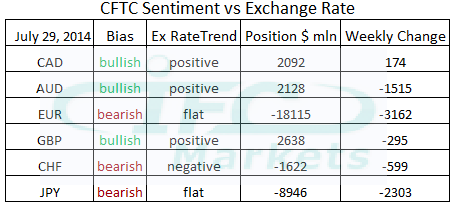 آخرین گزارش کمیسیون معاملات آتی کالا (CFTC) که آمار تا 29 ژوئیه را در برمی گیرد حاکی از آن است که سرمایه گذاران معاملات شان را به نفع دلار آمریکا ایجاد کرده اند. فعالان بازار در آستانۀ رویدادهای مهم، موقعیت های خریدشان روی دلار را افزایش دادند. همانطوریکه در جدول روحیۀ CFTC مشاهده می کنیم، یورو در برابر دلار آمریکا موقعیت خالص فروش اش را تا 18.11 میلیارد دلار افزایش داد که یکی از پایین ترین موقعیت های خالص فروش از سپتامبر 2012 تاکنون است. ضمن اینکه یورو با منفی 3.16 میلیارد دلار دارای بیشترین میزان تغییر هفتگی منفی در میان سایر ارزها شد. ین ژاپن در دارا بودن بیشترین تغییر منفی هفتگی رتبۀ دوم را دارد. فروش خالص روی ارز سامورایی با افزایش 2.30 میلیارد دلار نسبت به کاهش هفتۀ قبل، هم اکنون در منفی 8.94 میلیارد دلار به سر می برد.