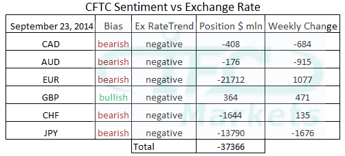 آخرین گزارش منتشر شده از سوی کمیسیون معاملات آتی کالا (CFTC) که آمار تا 29 سپتامبر را پوشش می دهد حاکی از آن است که سرمایه گذاران موقعیت خالص خریدشان روی دلار آمریکا در برابر ارزهای اصلی را از رقم 35.8 میلیارد دلار به رقم 37.36 میلیارد دلار افزایش داده اند. ما این موضوع را در جدول روحیۀ CFTC مشاهده می کنیم (CFTC Sentiment). تغییر منفی هفتگی بر ین ژاپن، دلار کانادا و دلار استرالیا غالب است.