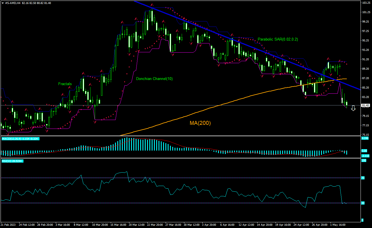 تحلیل تکنیکی نمودار چهار ساعتۀ قیمت سهام AMD نشان می دهد که AMD در نمودار چهارساعته (H4) به پایین خط بدون نوسان میانگین متحرک MA200 رسیده است. اندیکاتور RSI در محدودۀ "کف فروش" قرار دارد. اگر قیمت به پایین لبۀ تحتانی کانال Donchian در 81.22 برسد در آن صورت به اعتقاد ما حرکت نزولی ادامه خواهد داشت. می توان از سطح 81.22 به عنوان نقطۀ ورود به بازار برای قرار دادن یک دستور در حال انتظار برای فروش استفاده کرد. می توان توقف ضرر را بالای لبۀ فوقانی کانال Donchian در 90.76 قرار داد. توقف ضرر بعد از اجرای دستور در هر روز به سمت فراکتال فوقانی بعدی به دنبال علائم اندیکاتور Parabolic حرکت می کند. به این ترتیب، ما نسبت سود/زیان مورد انتظار را به نقطۀ تراز بین سود و زیان حرکت می دهیم. اگر قیمت بدون رسیدن به دستور در 81.22 به توقف ضرر در 90.76 برسد در آن صورت توصیه می کنیم که دستور لغو گردد زیرا بازار دچار تغییرات درونی ای شده است که مورد توجه قرار نگرفتند.