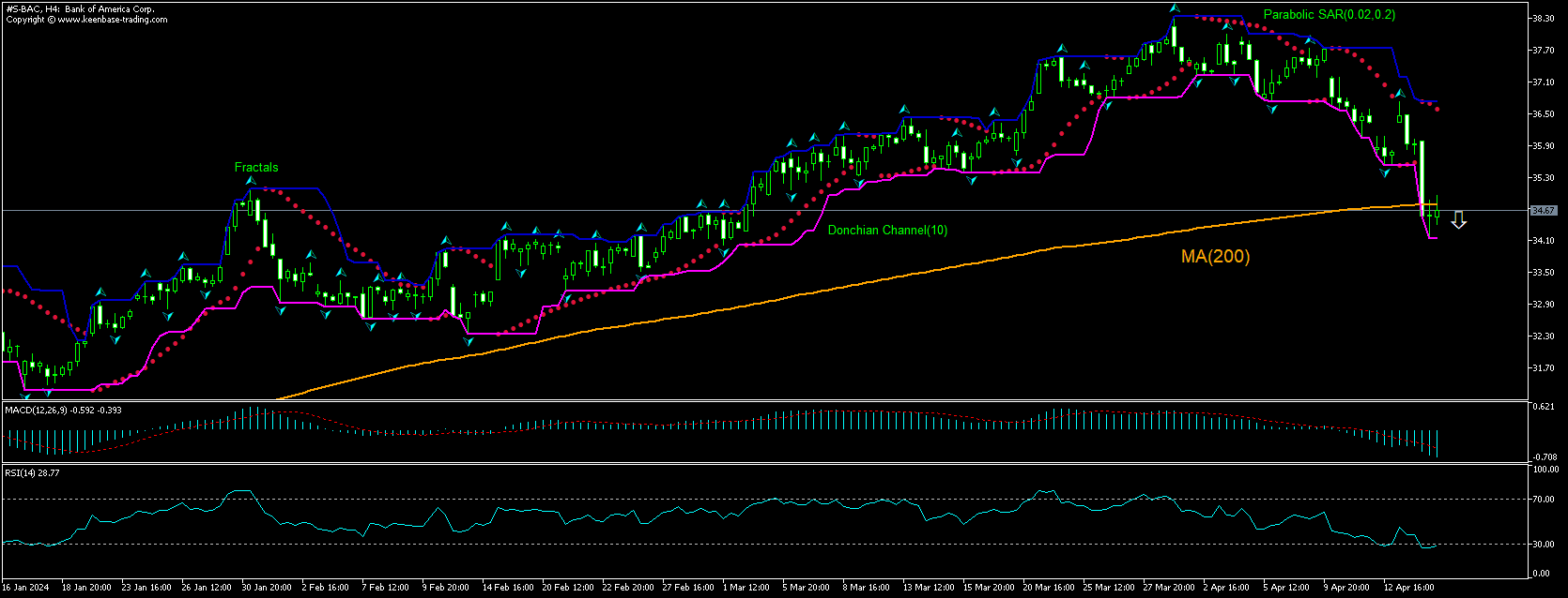 تحلیل تکنیکی نمودار چهارساعتۀ قیمت سهام Bank of America نشان می دهد که Bank of America در نمودار چهارساعته (H4) پایین خط صعودی میانگین متحرک MA200 رشد دارد. اندیکاتور RSI در آستانۀ خروج از محدودۀ کف فروش است. اگر قیمت به پایین لبۀ تحتانی کانال Donchian در 34.14 برسد در آن صورت به اعتقاد ما حرکت نزولی ادامه خواهد داشت. می توان از سطح 34.14 به عنوان نقطۀ ورود به بازار برای قرار دادن یک دستور در حال انتظار برای فروش استفاده کرد. می توان توقف ضرر را بالای فراکتال فوقانی در 36.73 قرار داد. توقف ضرر بعد از اجرای دستور در هر روز به سمت فراکتال فوقانی بعدی به دنبال علائم اندیکاتور Parabolic حرکت می کند. به این ترتیب، ما نسبت سود/زیان مورد انتظار را به نقطۀ تراز بین سود و زیان تغییر می دهیم. اگر قیمت بدون رسیدن به دستور در 34.14 به توقف ضرر در 36.73 برسد در آن صورت توصیه می کنیم که دستور لغو گردد زیرا بازار دچار تغییرات درونی ای شده است که مورد توجه قرار نگرفتند.