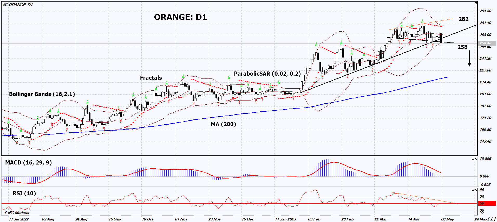 ORANGE (پرتقال) در نمودار روزانه (D1) ریزش داشته و از روند صعودی اش خارج شده است. چندین اندیکاتور تحلیل تکنیکی علامت یک حرکت ریزشی را می دهند. اگر ORANGE (پرتقال) در نمودار روزانه (D1) پایین آخرین کف در 258 ریزش پیدا کند در آن صورت از ایجاد یک حرکت نزولی صرف نظر نمی کنیم. می توان از سطح 258 به عنوان نقطۀ ورود به بازار استفاده کرد. می توان توقف ضرر اولیه را بالای علامت Parabolic، خط فوقانی بولینگر، آخرین فراکتال فوقانی و بالاترین سطح تاریخی در 282 قرار داد. ما بعد از باز شدن دستور در حال انتظار، توقف ضرر را به دنبال علائم بولینگر و Parabolic به سمت فراکتال تحتانی بعدی حرکت می دهیم به این ترتیب ما نسبت سود/زیان بالقوه را به نفع خودمان تغییر می دهیم. معامله گران محتاط می توانند بعد از انجام معامله به نمودار چهارساعته توجه کرده و در آنجا یک توقف ضرر قرار دهند و آن را در جهت روند حرکت دهند. اگر قیمت بدون فعال کردن دستور در 258 به توقف ضرر در 282 برسد در آن صورت توصیه می کنیم که دستور حذف گردد زیرا بازار دچار تغییرات درونی ای شده است که مورد توجه قرار نگرفتند.