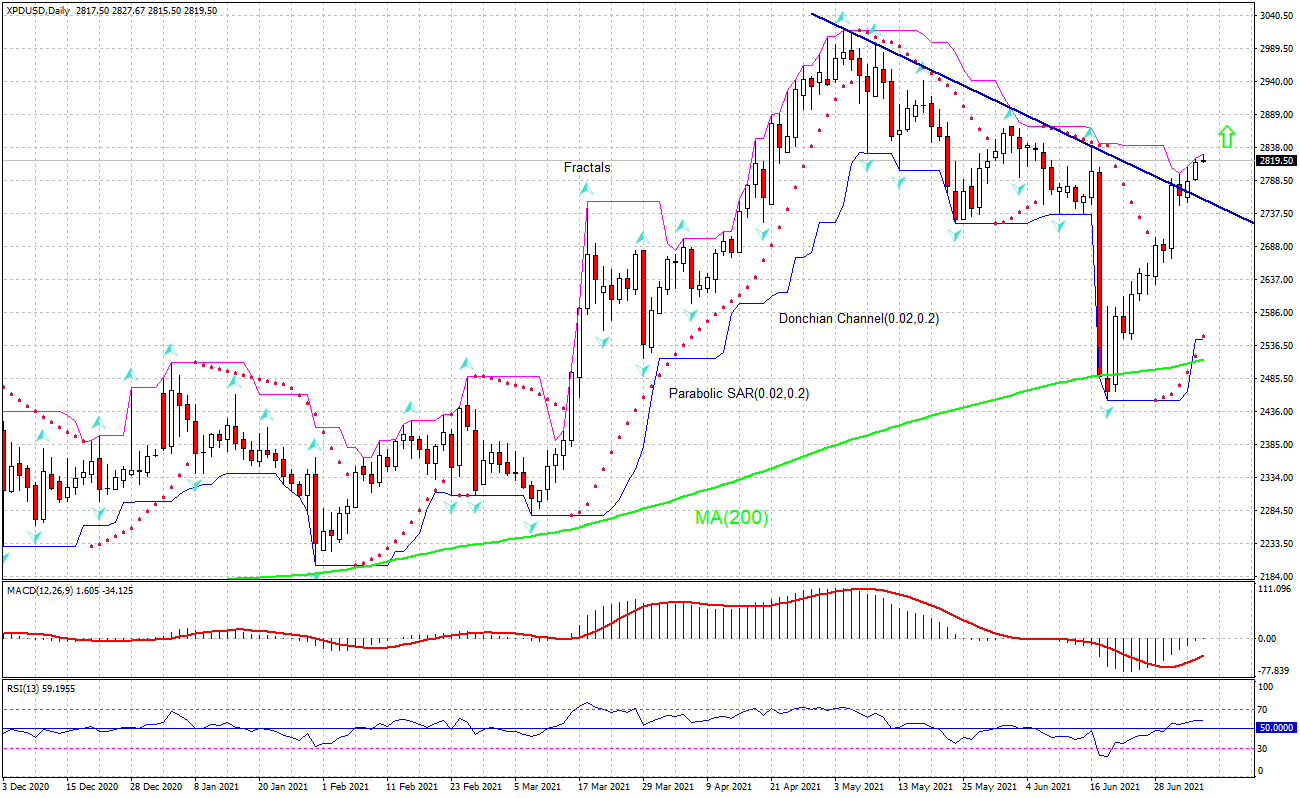 تحلیل تکنیکی نمودار روزانۀ XPDUSD نشان می دهد که XPDUSD در نمودار روزانه (D1) بالای خط صعودی میانگین متحرک MA200 از خط مقاومت عبور کرده است. اگر قیمت به بالای لبۀ فوقانی کانال Donchian در 2841 برسد در آن صورت اعتقاد داریم که حرکت صعودی شتاب پیدا کند. می توان از سطح 2841 به عنوان یک نقطۀ ورود به بازار برای قرار دادن یک دستور در حال انتظار خرید استفاده کرد. می توان توقف ضرر را پایین لبۀ تحتانی کانال Donchian در 2549.99 قرار داد. توقف ضرر پس از اجرای دستور در هر روز به سمت فراکتال تحتانی بعدی به دنبال علائم Parabolic حرکت می کند. بنابراین ما در حال تغییر نسبت سود/زیان پتانسیل به نقطۀ تراز بین سود و زیان هستیم. اگر قیمت بدون رسیدن به دستور در 2841 به توقف ضرر در 2549.99 برسد در آن صورت توصیه می کنیم که دستور لغو گردد زیرا بازار دچار تغییرات درونی ای شده است که مورد توجه قرار نگرفتند.