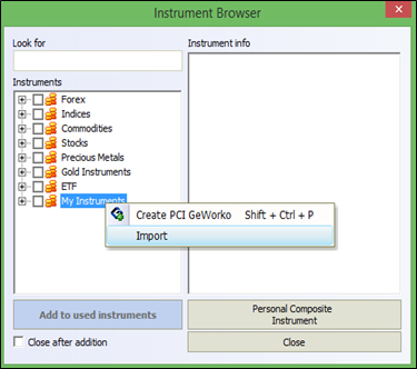 در پنجرۀ باز شده روی ردیف "ابزارهای من" (My Instruments) راست کلیک کنید تا فهرست زمینه باز شود. سپس عملکرد "ورود" (Import) را انتخاب کرده و فایل مربوطه یعنی فایل &BRENTEUR.pci را در ترمینال NetTradeX دانلود کنید.